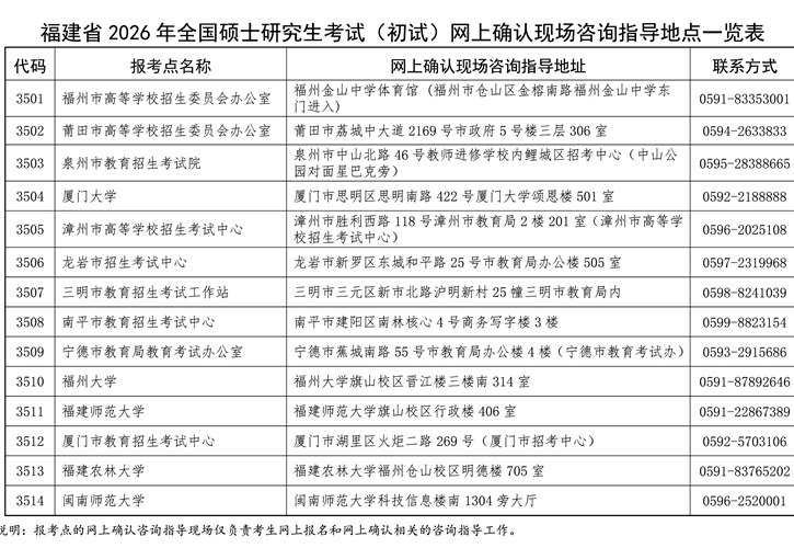 附件:福建省2026年全國碩士研究生考試(初試)網(wǎng)上確認現(xiàn)場咨詢指導地點一覽表