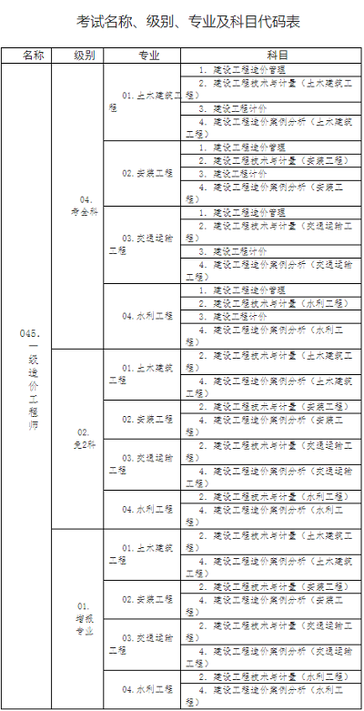 2022年湖北省一級造價工程師職業資格考試名稱、級別、專業及科目代碼表