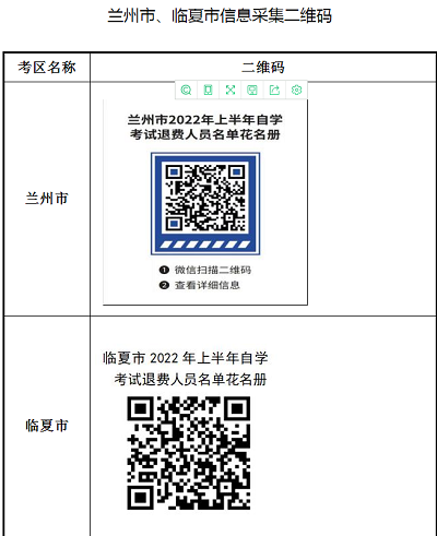 (一)網上填報課程并交納考試費的考生申請退費,須于4月22日前按要求將申請材料電子版提交至所報考區指定電子郵箱(見附件2)。電子版申請材料拍照或掃描應清晰完整,按考生姓名+準考證號命名形成壓縮包;蘭州市、臨夏市采取二維碼采集信息方式,考生掃描二維碼(見附件3)后根據要求填寫信息、上傳材料電子版。各考區教育招生考試機構進行核實,確定是否符合退費條件,超過受理時限或圖像不清晰完整的視同自愿放棄。