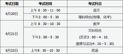 語文120分、數學120分、英語120分(聽力考試占20分)、理科綜合150分(物理80分、化學70分)、文科綜合150分(歷史75分、道德與法治75分) ,總分660分。